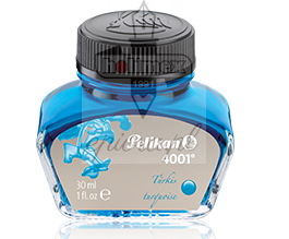 Atrament Pelikan 4001 turkusowy turquoise 30 ml charakteryzuje się głębią bardzo popularnego ostatnio koloru turkusu. Do produkcji Pelikana 4001 użyto najwyższej jakości składników co zapewnia komfort użytkowania na co dzień. Linia 4001 przeznaczona jest dla piór wiecznych marki Pelikan, można ją również stosować w innych piórach z tłokowym systemem napełniania lub konwerterem.