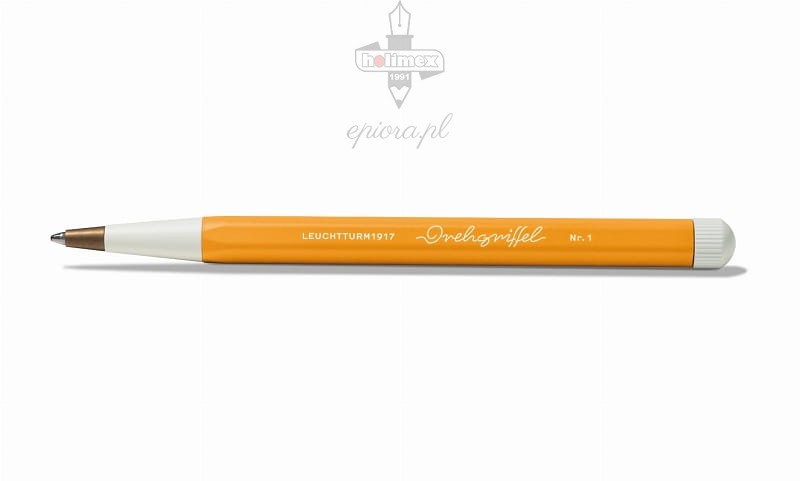 Długopis Leuchtturm1917 Drehgriffel Rising Colours Rising Sun stanowi najnowszą odsłonę kultowego instrumentu piśmiennego, tym razem w optymistycznym słonecznym odcieniu. Jest to współczesna wersja projektu z lat 20-stych minionego wieku. Prezentowany model wyróżnia się korpusem wykonanym z aluminium i mosiądzu, polakierowanym w stonowanym pomarańczowym kolorze. W centralnej części korpusu długopisu odnaleźć można logo Leuchtturm1917 i nazwę kolekcji. Ergonomiczna sekcja uchwytu, jak również obrotowy mechanizm wysuwania wkładu, wykonane zostały z kontrastującego białego tworzywa. Potwierdzeniem estetycznej wartości kolekcji Leuchtturm1917 Drehgriffel jest przyznanie projektowi nagrody Red Dot w 2020 roku.