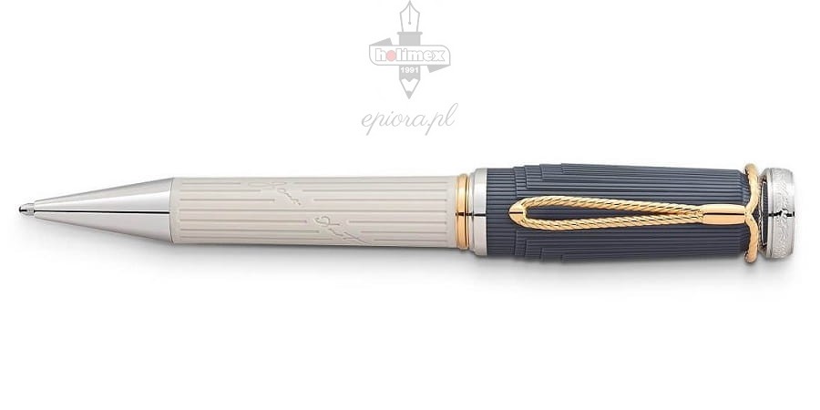 Długopis Montblanc Writers Edition Homage to Jane Austen dedykowany jest jednej z najbardziej znanych i cenionych brytyjskich powieściopisarek, której utwory podbiły serca czytelniczek na całym świecie. Wiele z nich doczekało się hollywoodzkich ekranizacji, z doskonałą obsadą, niezwykłą scenografią i kostiumami. Duch epoki powraca także w prezentowanej kolekcji. Korpus długopisu Montblanc Writers Edition Homage to Jane Austen wykonano z piaskowo-szarej i szaro-niebieskiej szlachetnej żywicy. W jaśniejszej sekcji ozdobiono go wzorem klasycznej kolumny, na której odnajdziemy wygrawerowany podpis pisarki. Z kolei ciemniejszy element nawiązuje do charakterystycznych kołnierzyków. Złote pierścienie i wykończenia pokryte zostały platyną. Korona instrumentu piśmiennego tradycyjnie ozdobiona jest logo Montblanc. Nietypowy klips ma kształt inspirowany sznurówkami z zapięciem jak damska torebka z początku XIX wieku, w której chowano lusterko, puder i chusteczkę. Całość, choć oszczędna w wyrazie, oddaje ducha epoki elegancji i wyrafinowania.