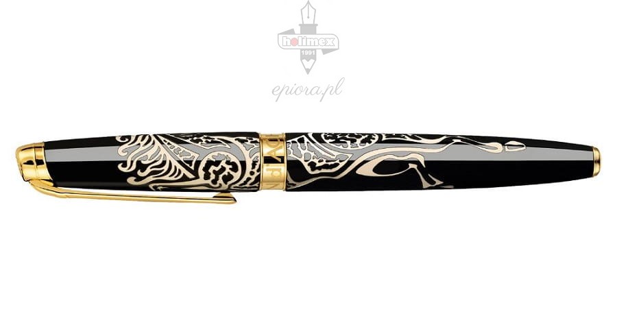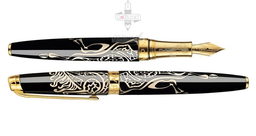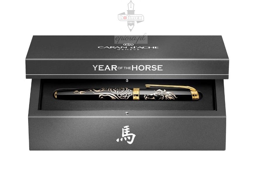 Ekskluzywne pióro wieczne dedykowane jest w tej odsłonie pięknemu i majestatycznemu zwierzęciu, stanowiącemu symbol wolności, życiowej energii i pewności siebie. Rok Konia obchodzono w 2014, a zgodnie z chińskim kalendarzem kolejny przypadnie na rok 2026. Instrument piśmienny zachwyca głęboką czernią korpusu i skuwki, na których kremowe wstawki układają się w podobiznę konia. Laka jest nanoszona tradycyjnymi technikami, przekazywanymi z pokolenia na pokolenie. Korpus ozdobiono subtelną czerwoną pieczęcią mistrza lakiernictwa, podkreślającą kunszt wykonania. O czym warto wspomnieć, do pióra dołączono certyfikat autentyczności dla chińskiego lakieru. Na pozłacanej sekcji uchwytu możemy odnaleźć podobiznę konia. Pióro wieczne wyposażone zostało w platerowany złotem klips ułatwiający mocowanie. Na koronie skuwki znajduje się logo Caran d'Ache. Rodowana stalówka wykonana została z 18-karatowego złota i też ozdobiona logo szwajcarskiego producenta. Kolejnymi elementami dekoracyjnymi są detale na platerowanym złotem pierścieniu, gdzie odnajdziemy nazwę producenta, numer seryjny i znak jakości Swiss Made. Gwarantuje on, iż prezentowane pióro wieczne wyprodukowano w Szwajcarii. Instrument piśmienny wyposażono w konwerter, który można stosować zamiennie z nabojami atramentowymi o standardowej konstrukcji. Dwa naboje startowe w niebieskim kolorze dołączono do pióra. Oprócz nich w zestawie znajduje się międzynarodowa dożywotnia gwarancja, książeczka z instrukcją i certyfikat autentyczności dla chińskiego lakieru.