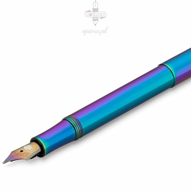 Pióro wieczne Kaweco Collection Liliput Kolibri to kolejna już odsłona wyjątkowej serii dedykowanej kolekcjonerom. W edycji przygotowanej na 2025 rok niemiecki producent postanowił w bardzo zmyślny sposób nawiązać swoim najmniejszym piórem wiecznym do... najmniejszego gatunku ptaku- Kolibra. Ich barwne upierzenie urzeka wyjątkowością dając efekt niesamowitego melanżu kolorów, co Kaweco postarało się przenieść na swoją hipnotyzującą wizualnie propozycję. Pióro wieczne Kaweco Collection Liliput Kolibri wykonane jest z aluminium i pokryte wielobarwną powłoka wykonaną w technologii PVD. Łącząc w sobie lekkość i niepowtarzalne połączenie kolorów będzie bez wątpienia łakomym kąskiem, nie tylko dla kolekcjonerów najmniejszego pióra wiecznego dostępnego w produkcji seryjnej. Elementem, który doskonale współgra z całością jest przepalana pozłacana stalowa stalówka. Warto zaznaczyć, że ze względu na wykończenie nie zaleca się pozostawiania na dłużej zaschniętego atramentu na jej powierzchni- może to prowadzić do uszkodzenia powłoki. Pióro wieczne Kaweco Collection Liliput Kolibri można zasilać zarówno za pomocą uniwersalnych nabojów atramentowych, jak i tłoczka Kaweco Mini składanego.