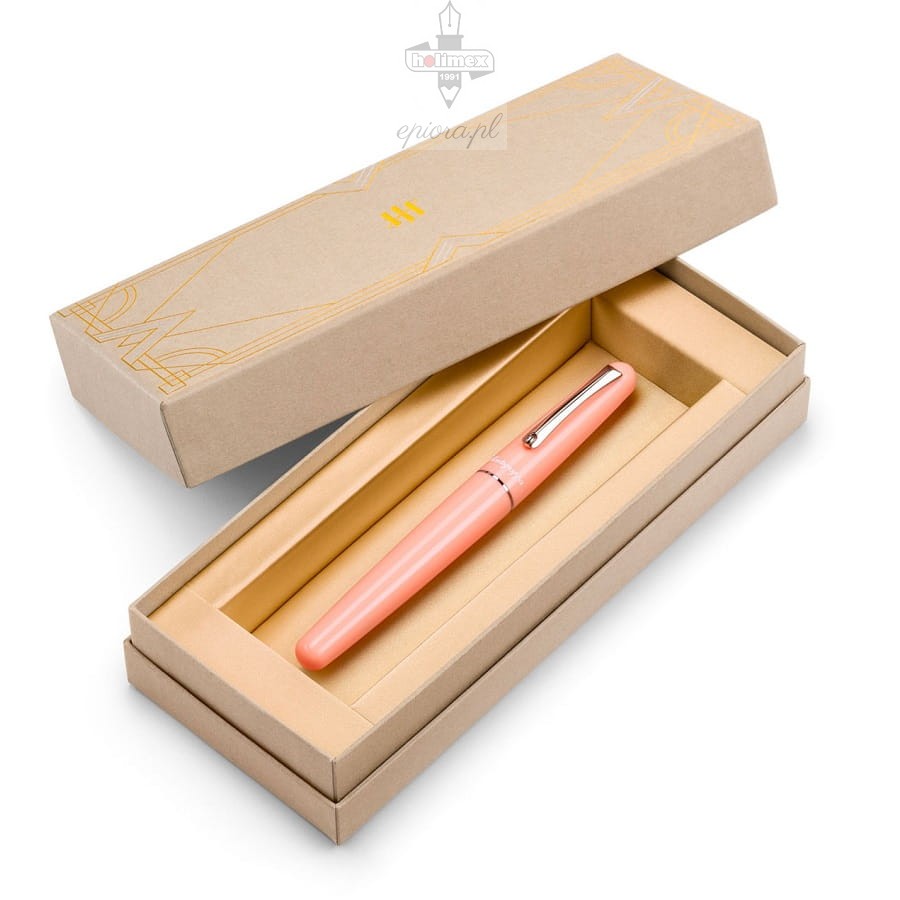 Pióro wieczne Montegrappa Elmo 01 Peach Fuzz brzoskwiniowe stanowi odważną propozycję kolorystyczną, która bez wątpienia zachwyci miłośników pastelowej palety barw. To również odcień Pantone na rok 2024, a więc doskonały pomysł na prezent dla osób śledzących najnowsze trendy. Prezentowany model pióra wiecznego, obok wariantu Frost, to świeża odsłona popularnej kolekcji, nazwanej na cześć współzałożyciela i pierwszego dyrektora technicznego marki Montegrappa. Heinrich "Elmo" Helm był nie tylko ambitny i oddany pracy, ale przede wszystkim niezwykle kreatywny. Pierwsze produkty tej retro kolekcji szybko stały się bestsellerem i obecnie na rynek wprowadzono kolejny wariant kolorystyczny piór wiecznych, piór kulkowych i długopisów Montegrappa Elmo. Prezentowane pióro wieczne to minimalizm i funkcjonalność w jednym. Żywica korpusu w brzoskwiniowym kolorze pięknie kontrastuje ze srebrnymi wykończeniami. Doskonałe wyważenie pióra pozwala cieszyć się jego użytkowaniem. Całości dopełnia subtelna, biała nazwy firmy u podstawy skuwki i grawerunek na stalówce, wykonanej z najwyższej jakości stali nierdzewnej. Instrument piśmienny wyprodukowano we Włoszech, z najwyższą dbałością o detale.