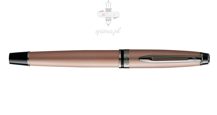 Pióro wieczne Waterman Expert Metallic Rose Gold RT to nowoczesna interpretacja klasycznej kolekcji. Zestawienie kolorów, które przede wszystkim podbije serca żeńskiego grona miłośniczek piór wiecznych charakteryzuje się wyjątkową elegancją. Lakier w odcieniu różowego złota pokrywa korpus i skuwkę, natomiast całość uzupełniają ciemne wykończenia pokryte drogocennym rutenem. Charakterystyczny dla kolekcji klips oraz pierścień skuwki również platerowany jest tym metalem. Stalówka idealnie harmonizuje z całością dzięki pokryciu jej czarną powłoką przy wykorzystaniu technologii PVD. W zestawie znajduje się niebieski nabój startowy, ale można zamiennie stosować tłoczek (do dokupienia oddzielnie). Pióro wieczne Waterman Expert Metallic Rose Gold produkowane jest we Francji.
