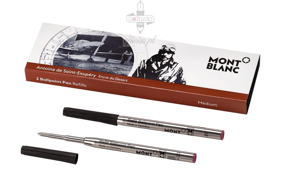 Wkłady do długopisu Montblanc Antoine de Saint Exupery M brązowe 2 szt. są uzupełnieniem popularnej kolekcji piór, długopisów i atramentów, poświęconej Antoine de Saint-Exupery'emu. Firma Montblanc oddała w ten sposób hołd wybitnemu francuskiemu pisarzowi, poecie, dziennikarzowi i pionierowi lotnictwa. Kolor wkładów inspirowany jest kolorem pustyni o zachodzie słońca - encre du desert. W brązowym odcieniu jest również pióro wieczne Montblanc Meisterstuck Classique Le Petit Prince oraz dedykowany atrament. Wkłady w ilości dwóch sztuk zabezpieczone są plastikową nakrętką i zapakowane w kartonowe pudełeczko Montblanc.